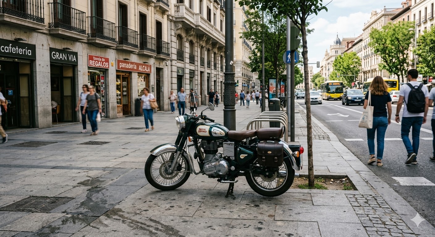Aunque la norma general de tráfico prohíbe estacionar en aceras, paseos y zonas peatonales, los ayuntamientos pueden abrir una excepción para las motos, y Madrid lo hace… con letra pequeña. La Ordenanza de Movilidad del Ayuntamiento permite que las motocicletas y ciclomotores aparquen en la acera solo cuando se respetan unas condiciones muy claras pensadas para que el peatón no tenga que hacer off-road urbano.