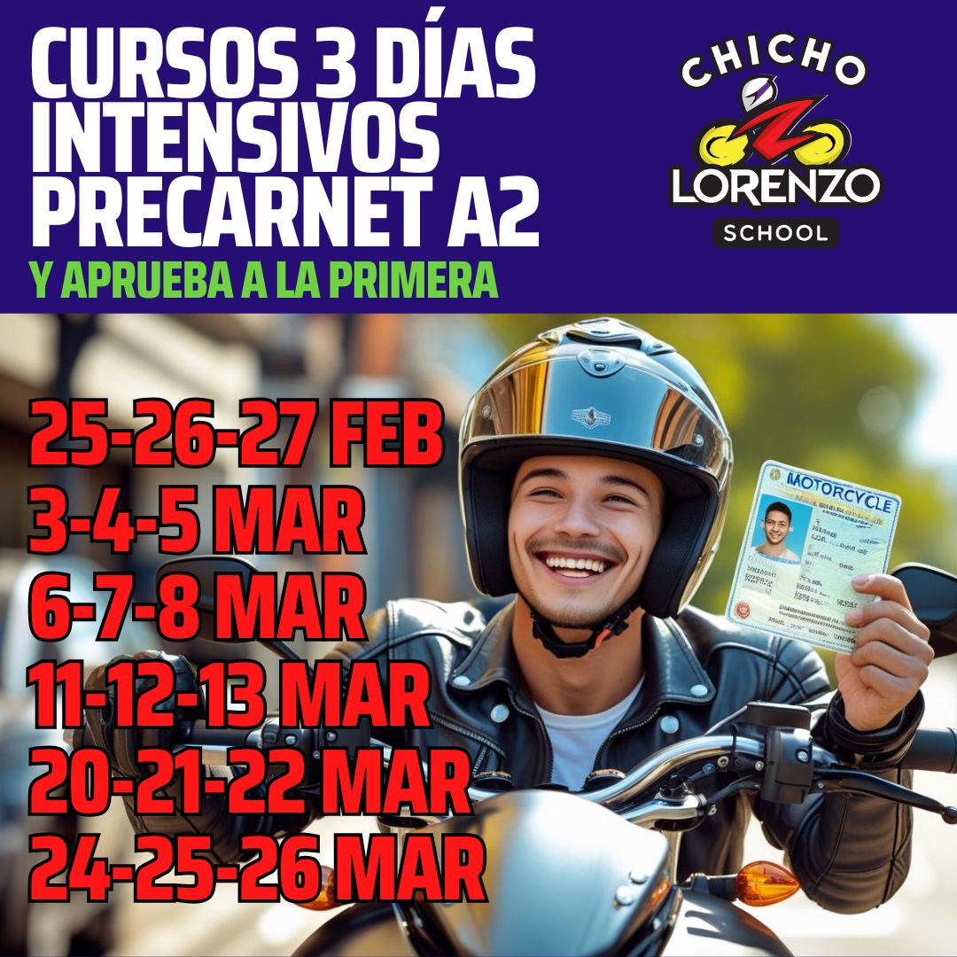 Podrás VER TODOS LOS DETALLES DE ESTE CURSO Y contratarlo en Curso Moto Pre-carnet A2 (chicholorenzo.com) hasta agotar plazas. Para coordinar bien tu formación intensiva contacta por whatsapp o llamada en el 698 923 439 (Madrid)